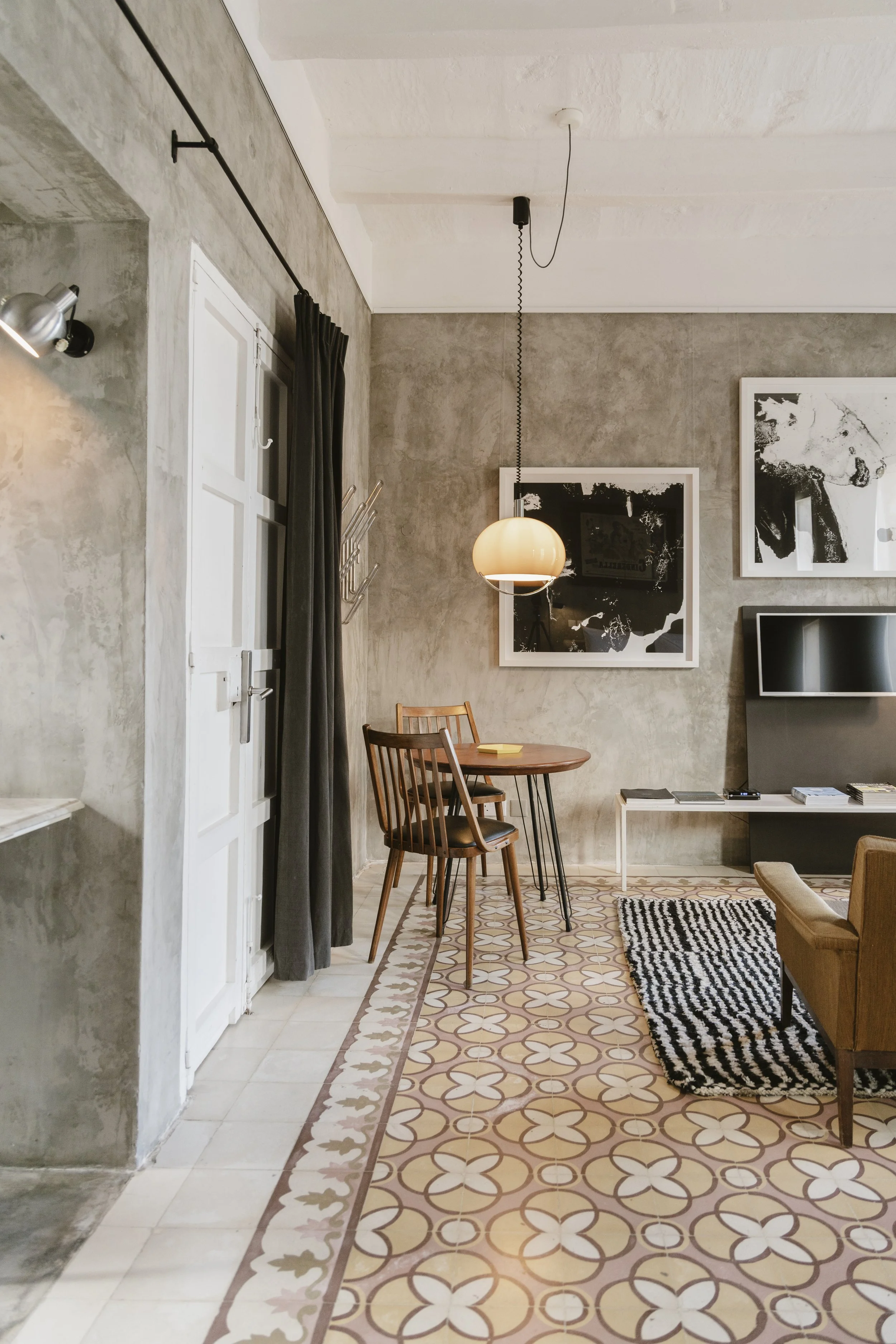 A busy architects’ studio previously, ATELIER is located on the second floor and enjoys sea views with direct sunlight from its south-facing windows and traditional 'gallarija'. The minimal interior furnishings are a mix of lightweight steel & timber objects set on original patterned tiles and furnished with retro & designer pieces.